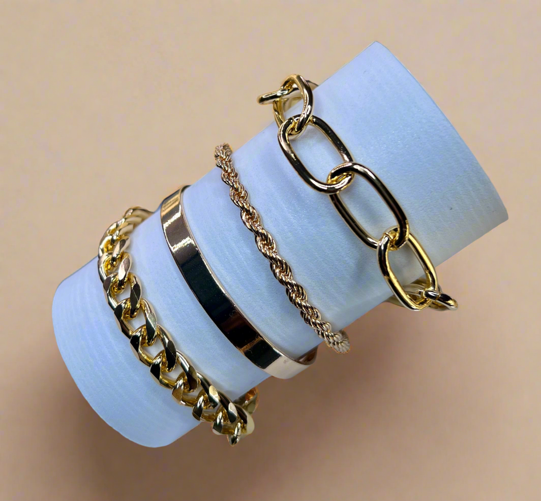 Introducing the ‘Gilded Links’ stack bracelet set from the Dani Bijoux Collection – a stunning blend of timeless elegance and modern charm. This curated set features a variety of bold gold textures, from classic chains to intricate rope designs, symbolizing strength and connection. Each bracelet in this stack stands out on its own, yet together they create a cohesive, gilded statement that elevates any look.